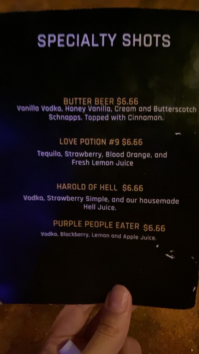 Others (Specialty Drinks): This category contains premium mixed drinks and signature concoctions crafted with a variety of liquors and mixers. Options include The Jekyll & Hyde with Tanqueray and Bulleit bourbon, Hocus Pocus featuring gin and habanero, Frog's Breath combining peach cognac with matcha and ginger, and Screamin' Tiki which includes peanut butter whiskey and Frangelico, with prices ranging from $11 to $15.